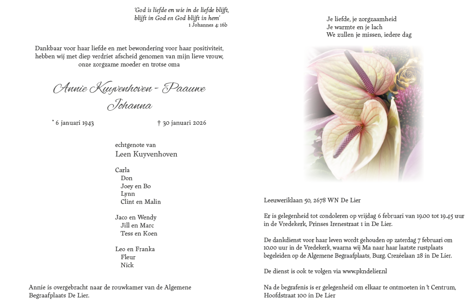 Zaterdag 7 februari 2026 om 10.00 uurDankdienst Annie Kuyvenhoven-PaauweVoorganger(s): ds. Lennart van Berkel Organist: Christian Hutter Beamer: Koos de Rijke |